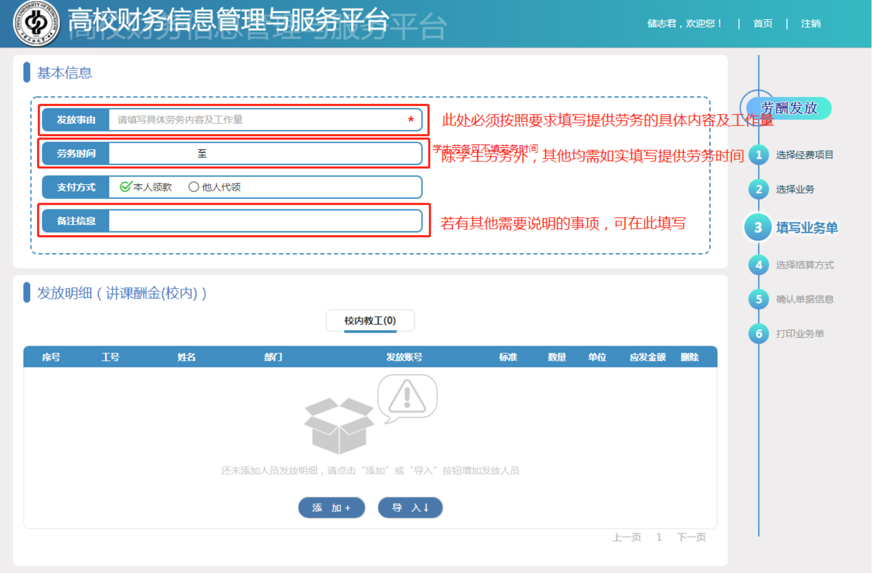u 劳务时间:除学生劳务外,发放其他劳务费时,必须填写劳务提供时间