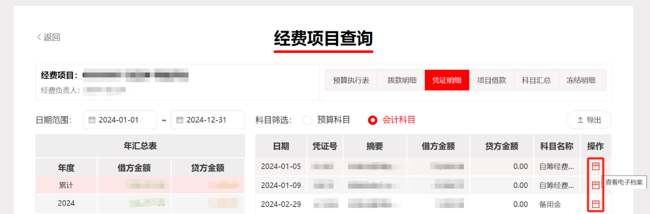 方式2:通过经费项目查询,此方式查看经费项目下的电子凭证。查询步骤:登录综合财务信息平台,【信息查询】-【经费项目查询】-【选择经费项目】-【凭证明细】,在操作列点击查看电子档案。