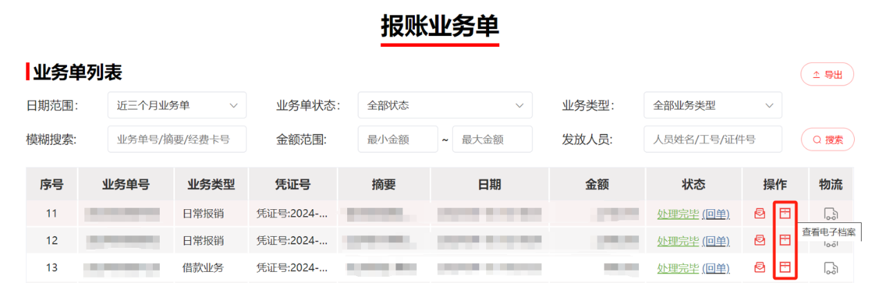 方式1:通过报账业务单查询,此方式查看已处理完毕的单个业务单电子凭证。查询步骤:登录综合财务信息平台,【业务办理】-【报账业务单】,在业务单操作列点击查看电子档案。