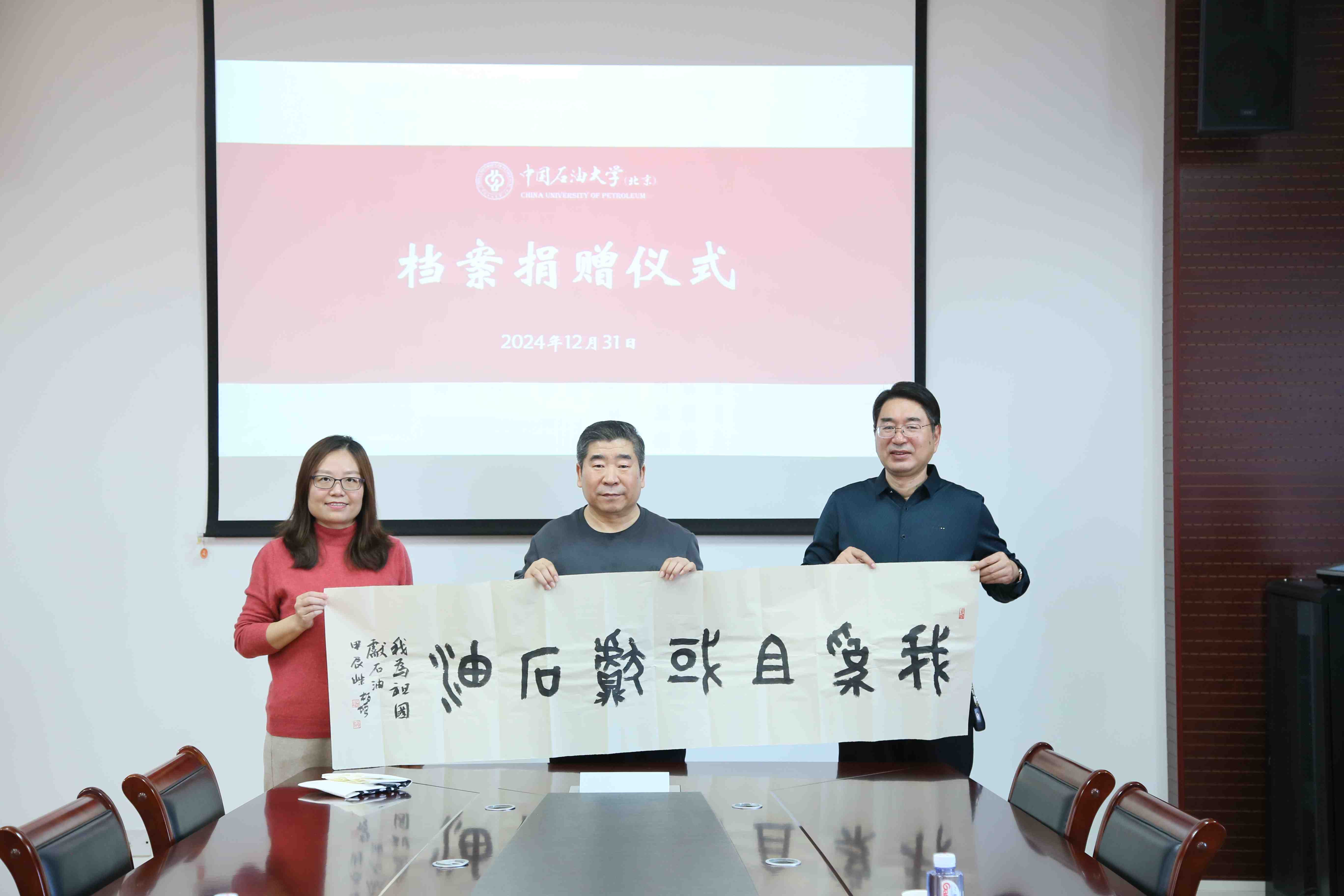 仪式上,柴柏增捐赠了由其书写的两幅金文大篆字体的书法作品《我为祖国献石油》(学校校歌名称)和《实事求是 艰苦奋斗》(学校校风)。海凤、宋刚代表图书馆(档案馆)接受捐赠,并为柴柏增颁发捐赠证书。
