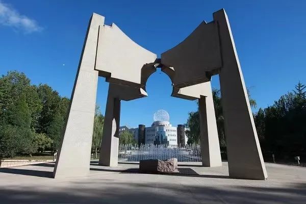 青年园南侧的“开启智慧之门的钥匙”与青年园北侧图书馆遥相呼应。钥匙形立柱隔空簇拥图书馆顶端地球造型。四座钥匙形立柱分别象征着当时beat365在线唯一官网(北京)的四大优势学科——石油地质、石油工程、石油化工与石油机械,立柱下方中央的长石下有水泵带动喷水池中的水穿过石孔流出,寓意为石油滚滚流。
