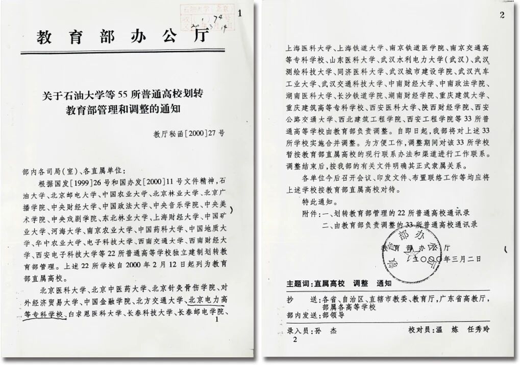 关于石油大学等55所普通高校划转教育部管理和调整的通知