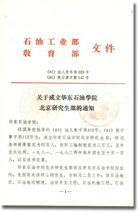 1977年10月、1978年1月,国务院、教育部分别下发关于研究生招生的文件,要求有条件的高校要积极招收研究生。1981年,学校获准在北京原校址内成立华东石油学院北京研究生部,并于同年开始正式招生。
