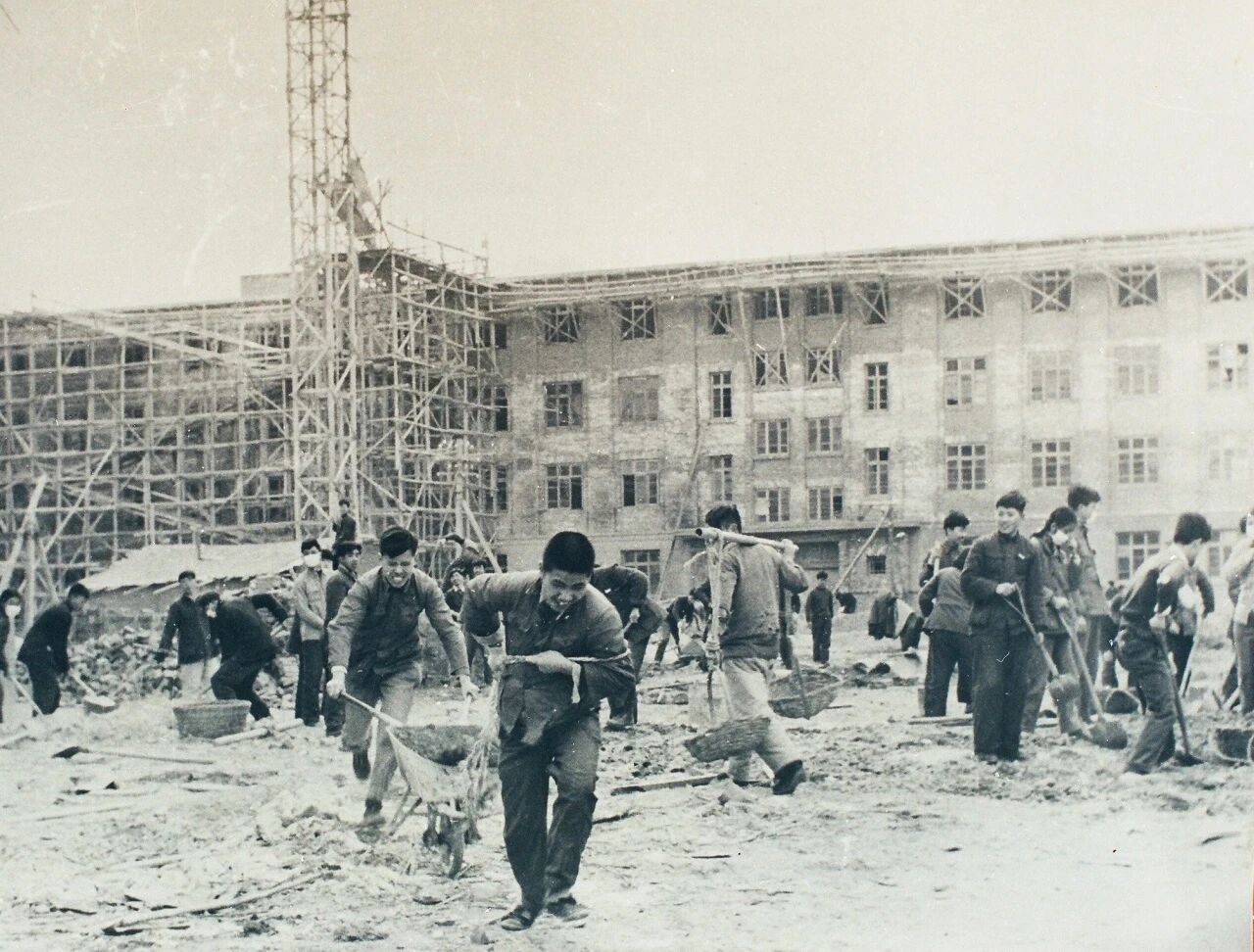 “教师学生住的是工字楼,工字楼没完工的,那个餐厅也是没完工。教室只有南北教室楼,没有完全完工,别的楼都没有。其实那个时候条件是比较艰苦,但是生活大家觉得还挺不错,新的学校盖起来了,觉得很有发展前途。我们那时候参加了学校的建设,入学以后修青年园,后来又建了红旗操场,然后东操场,这都是我们亲手参加劳动建起来的,我们觉得建校也有我们的一份责任。”(张铁麟)