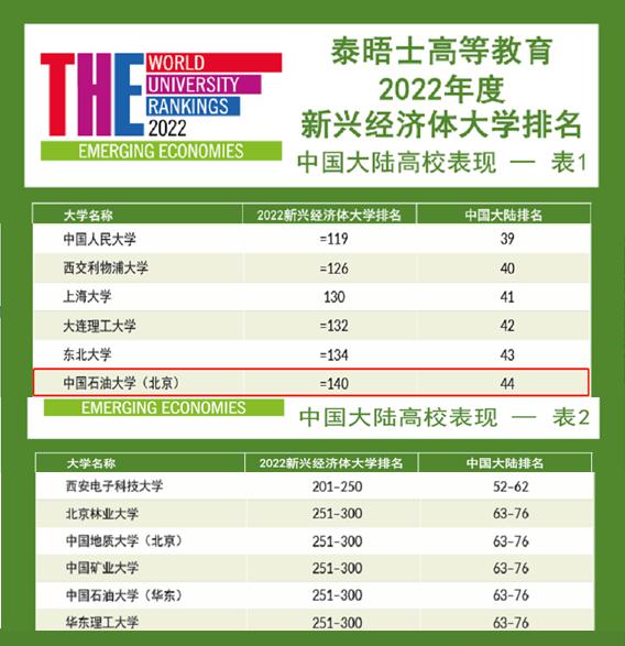 10月20日,泰晤士高等教育(简称THE)发布了2022年度新兴经济体大学排名(Emerging Economies University Rankings 2022),来自50个国家和地区的698所大学上榜,中石大位列全球第140位、中国内地高校第44位、北京高科大学联盟高校第2位。