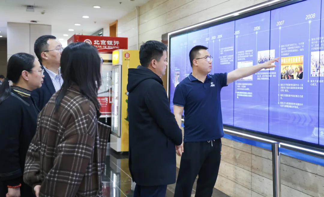 会前,周玉成一行在武中豪的带领下,参观了“新东方阅读空间”,并通过智能大屏对新东方的品牌文化理念、集团业务体系、发展历程、社会责任等各方面情况进行了全方位了解。