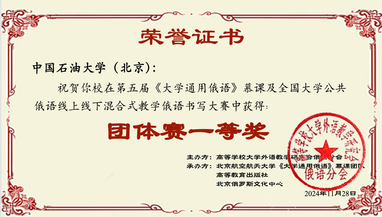 喜报:中石大在全国大学俄语书写大赛中荣获团体赛一等奖