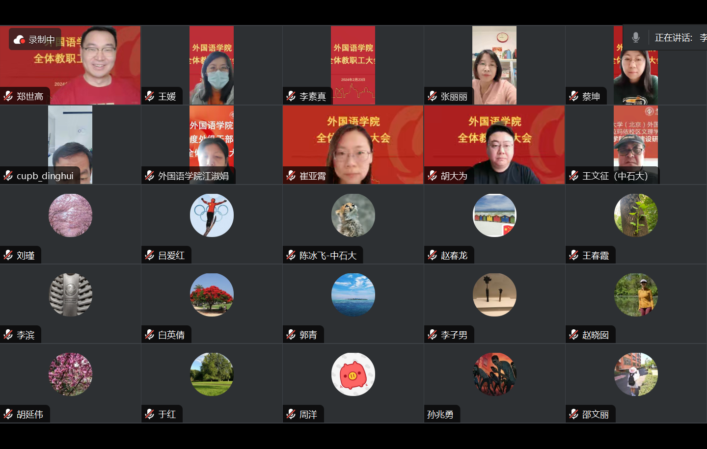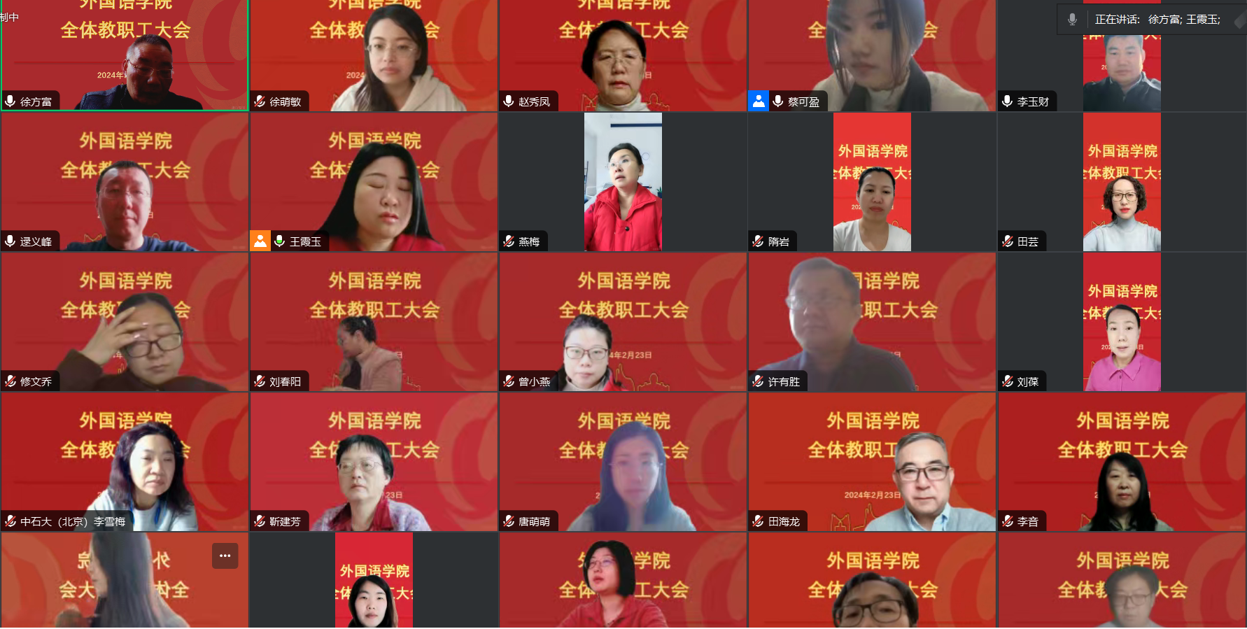 2月23日上午,外国语学院2024年春季学期开学初全体教职工大会于线上召开,学院领导班子成员及全体教职工参加会议,会议由学院党委书记李玉财主持。