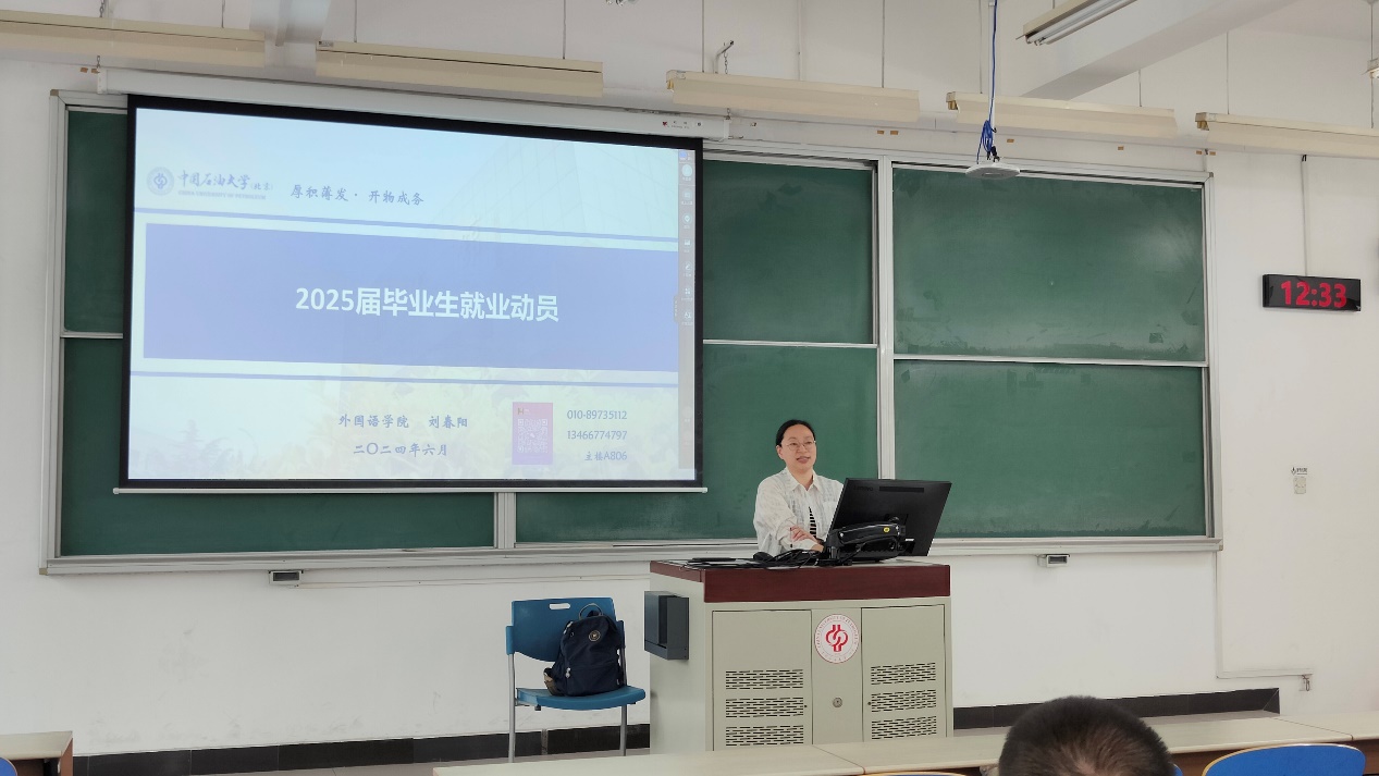 为向外国语学院2025届毕业生普及就业升学形势,明确个人发展方向,帮助毕业生把握就业良机,实现高效备考,实现高质量就业,外国语学院于2024年6月14日在三教206举行了2025届毕业生就业动员会。学院党委副书记刘春阳、2025届毕业生辅导员谌丛和邓泽健参加此次会议。