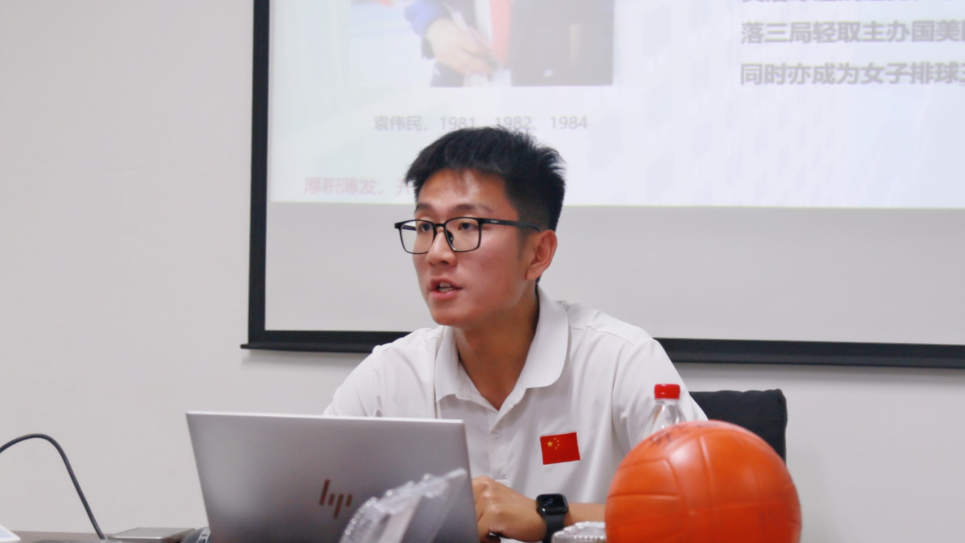蒋名晨讲解了中国女排的历史、成就及“女排精神”,强调了“女排精神”在体育竞技中的重要性。蒋名晨聚焦于“基础排球动作解析和运动损伤的防护”,通过标准动作示范讲解了排球的基本击球技巧,同时系统介绍了运动前热身和运动后恢复的重要性,并带领与会教师进行现场练习。蒋名晨在交流环节对与会教师提出的问题进行了解答。