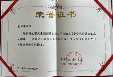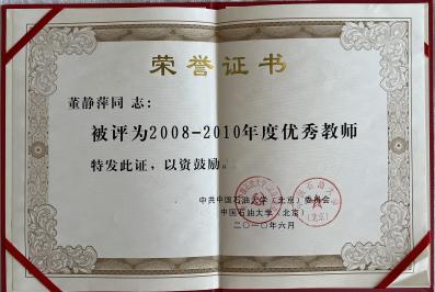 “要想给学生一杯水,自己要至少有一桶水。”董静萍深刻理解这个道理。她在任教期间从未间断自修和进修,不断学习让她对自己的教学能力充满信心。作为骨干教师,她曾教授全脱产石油系统工程技术人员和干部的高级、中级、准中级各层次《精读》《听力》《视听说》《翻译》《职称外语考试辅导》《商务综合英语》《TOEFL考试辅导》等课程、本科生《大学英语》《综合英语》《高级综合英语》《英语听力》、硕士生《系统功能语言学》《国外外语教学法流派》等课程,指导本科、硕士论文和创新创业实践,培养出众多行业精英和功勋;发表论文二十余篇,多次荣获校级先进教师和教改奖。她认为“教学相长”“老师永远在学习的路上。”她有一颗好奇之心,勇于挑战,敢于创新。她牢记“努力成为有理想信念、有道德情操、有扎实学识、有仁爱之心的‘四有’好老师,当好学生成长的引路人。”