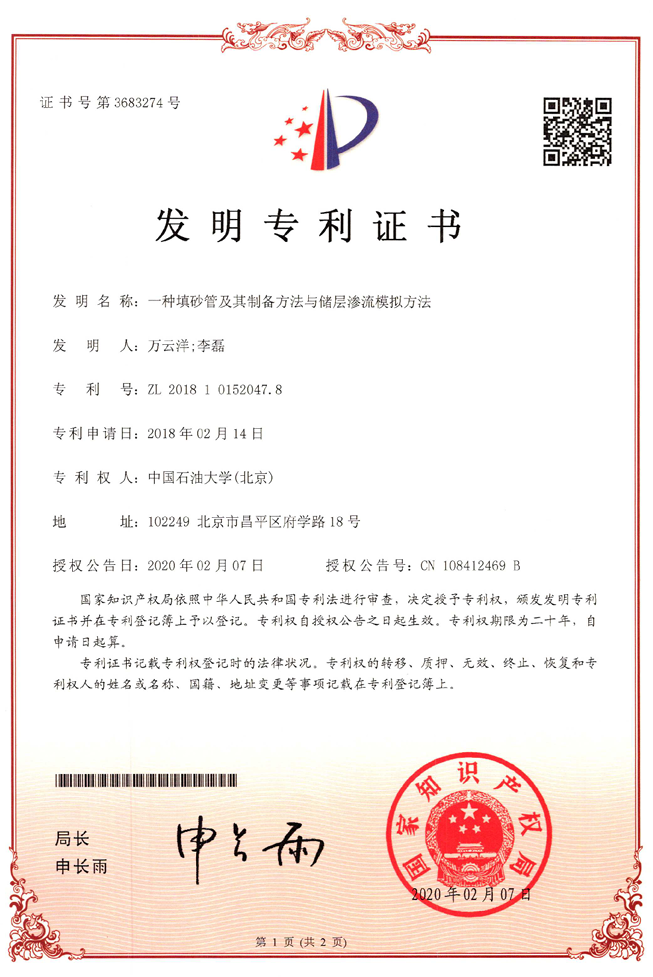 微生物地质学实验室万云洋团队在储层模拟实验方法方面取得进展,《一种填砂管及其制备方法与储层渗流模拟方法》发明专利获得国家知识产权局批准,授权专利号为ZL 201810152047.8,证书号为第3683274号。