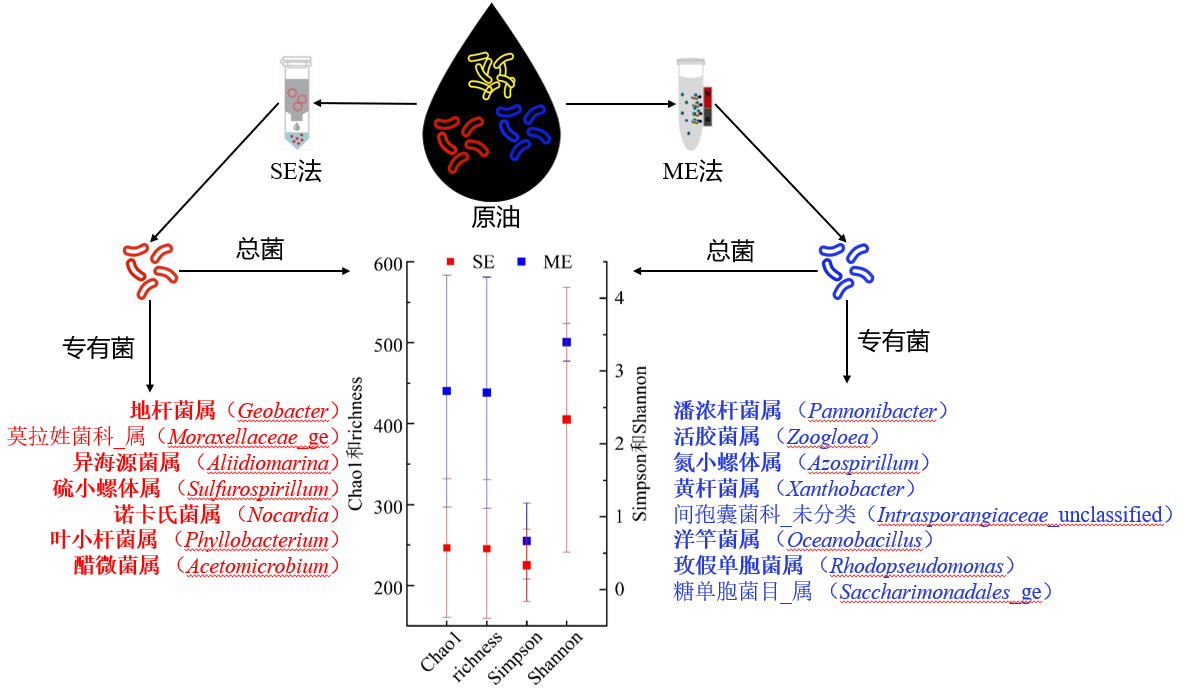 部分成果以论文《柱式法和磁珠法提取原油脱氧核糖核酸》在领域专业高水平期刊《beat365在线唯一官网学报(自然科学版)》上发表(知网首发:2024年11月28日,https://zkjournal.upc.edu.cn/zgsydxxben/article/html/20250424)。目前核酸提取方法的分类主要分为柱式法(spincolumn based extraction method,SE)和磁珠法(magnetisable solid phase extraction method,ME),两类方法是核酸提取最为常用的两类纯化方法,已有少数关于两类方法在非油藏样本上效果比较的报道,褒贬不一,迄今尚未有相关报道评价它们对原油样本的适用性。本文首次在油藏微生物领域比较了SE和ME直接对原油微生物DNA提取的适用性,对长庆油田同一批采集12个原油样本使用SE和ME两种方法提取核酸并进行了质量检测及菌群结构和多样性分析,结果表明,两方法对部分微生物存在专有的响应性,SE提取质量浓度更高并对油藏微生物有更好响应,ME灵敏度更高、稳定性更强并对总微生物群落结构和多样性有更好的响应,进一步揭示了这两类核酸提取方法的应用前景。论文得到了匿名评审专家的肯定评价,“论文的结构和层次清楚合理”、“作为第一篇比较文章,为未来的工作有良好的指导意义”。本团队的相关工作也可见论文《Rapid Accuracy determining DNA purity and concentration in heavy oils by spectrophotometry methods》(Petroleum Science,https://www.sciencedirect.com/science/article/pii/S1995822623001863 ;/dwzx/xwdt/cg/0e328026d71744fdad4a48151ee44b47.htm)、《基于自主核酸提取方法分析单油井采出液微生物》(油气田环境保护,https://yqtb.cbpt.cnki.net/portal/journal/portal/client/paper/0c3608622f40f37eaf36bd0226e34384 ;
