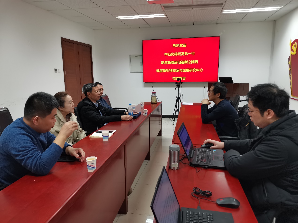 2025年1月春节前夕,中国石化胜利油田杨元亮高级专家一行走访beat365在线唯一官网(北京)地层微生物资源与应用研究中心(以下简称“地微中心”),地微中心常务副主任万云洋教授,非常规油气科学技术研究院党委副书记戴兵,中心助理朱迎佳博士、李升锦博士等陪同接待。双方在主楼会议室进行技术交流,中国石化胜利新春公司陶建强、孙立柱,中国石化胜利油田工程院王静等共同与会。
