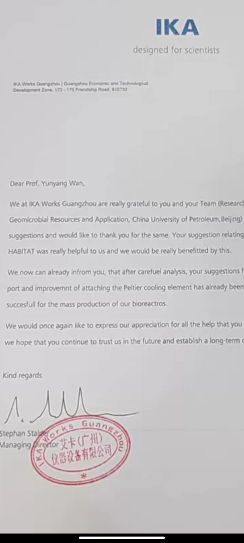 艾卡(IKA)选择地微中心作为其在中国(亦是全球)第一台样机(原型机)试用方,疫情期间运送到实验室希望给予调试。地微中心团队根据学校疫情政策,组织李升锦等同学见缝插针的克服困难给予大量调试,2021-2022年期间给该公司提出了几十条有价值的的意见和建议,并和其研发团队进行了多次线上交流,使其发酵罐真正产生了实际使用价值。该母公司和国内公司对此高度认可,并给地微中心专门发来感谢信。