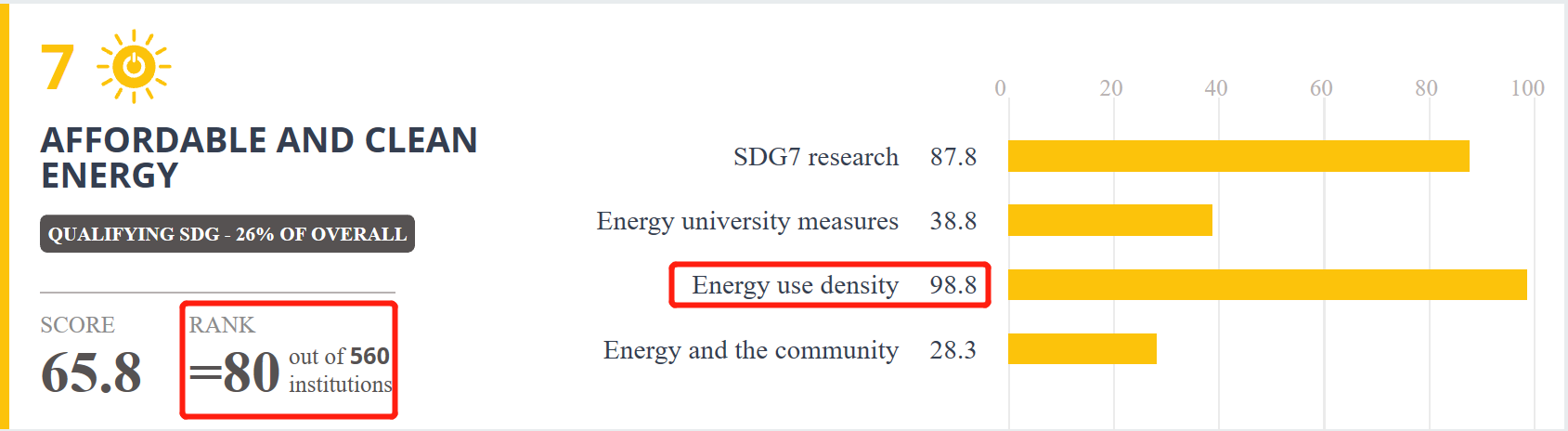 SDG7 measures universities' research related to energy, their energy use and policies, and their commitment to promoting energy efficiency in the wider community. In SDG7, the total score of CUP is 65.8, and the scores of energy use density and scientific research are 98.8 and 87.8, reflecting the practical consideration and action effect of CUP in the transformation and upgrading of the energy industry and serving the construction of a modern energy system towards the target of the carbon neutrality and peak carbon dioxide emissions.