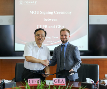On the morning of September 16, Dr. Pavel Korolev, Vice-President of the Global Energy Association (GEA) with other two experts visited CUP to discuss the cooperation on the matter of the 2020 Global Energy Prize Summit undertaking by CUP, and signed the Partnership and Cooperation Memorandum with CUP. President Zhang Laibin met with the delegation from GEA, and staff from the WEUN Secretariat and the International Office also attended this meeting.