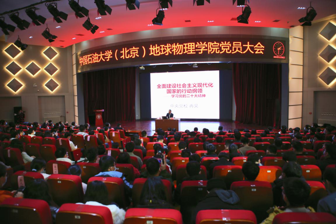 为深入学习贯彻党的二十大精神,结合学校11月份组织生活学习安排,11月3日,地球物理学院召开全体党员大会线上线下相结合集中开展11月份组织生活学习,主会场设在教工活动中心,大会邀请了中共中央党校科学社会主义教研部冉昊副教授作党的二十大精神专题讲座,学院全体党员参加学习,大会由学院党委书记周玉成主持。