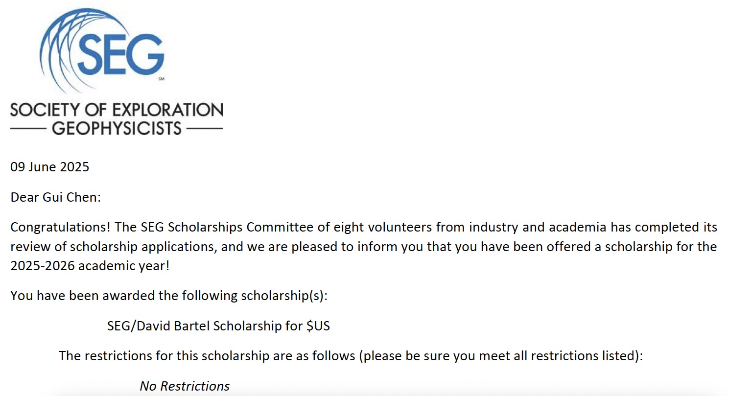 近日,地球物理学院博士生陈桂荣获2025–2026年度国际勘探地球物理学家学会SEG/David Bartel奖学金,表彰他在地球物理领域所展现出的优秀学术能力与科研潜力,亦彰显了我院在地球物理高层次人才培养方面的优质成效。