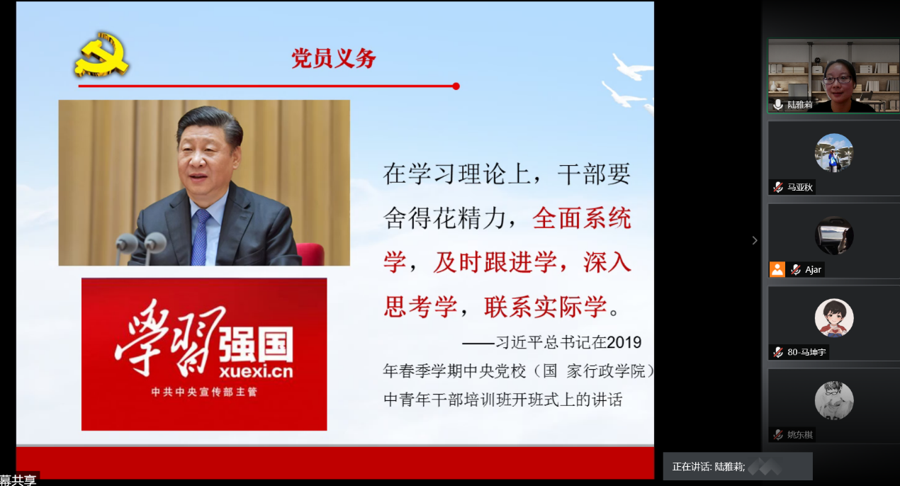 陆雅莉结合我国疫情防控战斗中涌现出的优秀党员典型事迹,与参会党员一起重温了《中国共产党章程》中关于党员的重要内容,包括党员条件,党员性质、党员义务、入党誓词四个部分。她希望毕业生党员在以后的学习和工作中能够牢记党员身份,履行党员义务,做到“平常时候看得出来,关键时候站得出来,危难时候豁得出来”,时时处处发挥党员先锋模范作用;要坚持用好“学习强国”平台,加强理论学习,用理论武装头脑;要把入党誓词内化于心、外化于行,时刻保持对党的忠诚,用实际行动践行对党的誓言承诺。