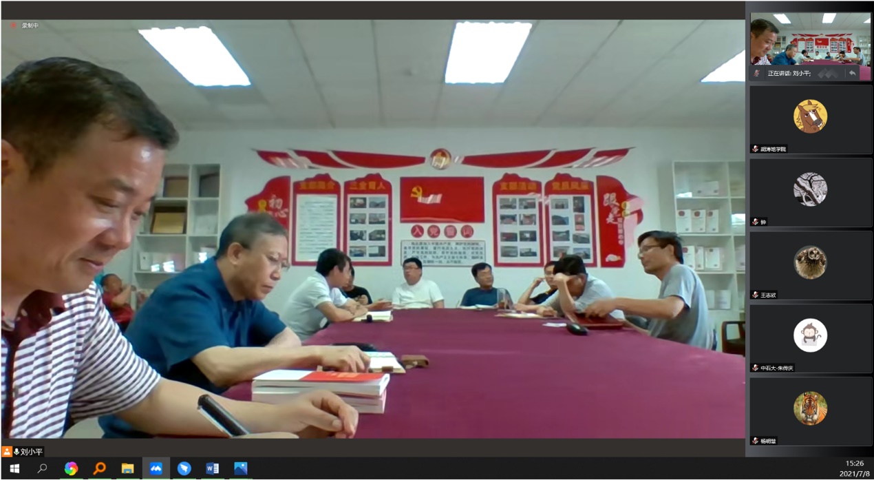 2021年7月8日下午,地球科学学院盆地与油藏研究中心教工党支部召开“学党史、悟思想、办实事、开新局”党史学习教育专题组织生活会,会议通过线下(在地质楼721党员活动室)和线上(腾讯会议)两种形式展开,支部共有26名党员参加了,其中3名正在辽宁兴城带本科生野外综合地质实习的教工党员线上参加。