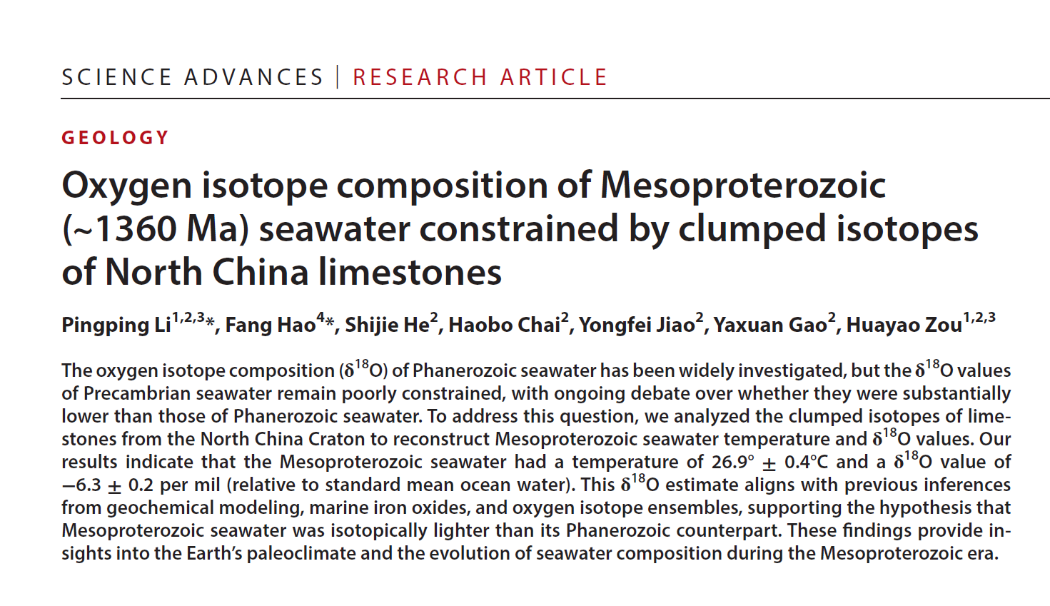 近日,地球科学学院李平平教授作为第一作者的学术论文“Oxygen isotope composition of Mesoproterozoic (~1360 Ma) seawater constrained by clumped isotopes of North China limestones”在《Science Advances》上正式发表。《Science Advances》是由美国科学促进会(AAAS)出版的综合性自然科学期刊,是国际顶级期刊《Science》旗下的综合性子刊,近5年影响因子为14.1。本论文由beat365在线唯一官网(北京)和beat365在线唯一官网(华东)联合发表,beat365在线唯一官网(北京)油气资源与工程全国重点实验室为第一完成单位,通讯作者为李平平教授与郝芳院士。