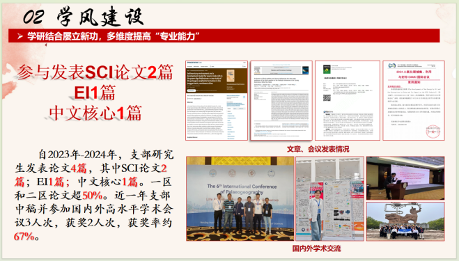 2023级地研23-4团支部 作为研究生团支部,通过思想引领,党团为标同心筑牢思想之基;学风建设,学习争先发挥青年磅礴力量;支部风采展示,展青春之姿同频共振新时代。支部研究生发表论文4篇,其中SCI论文2篇;EI1篇;中文核心1篇;一区和二区论文超50%。