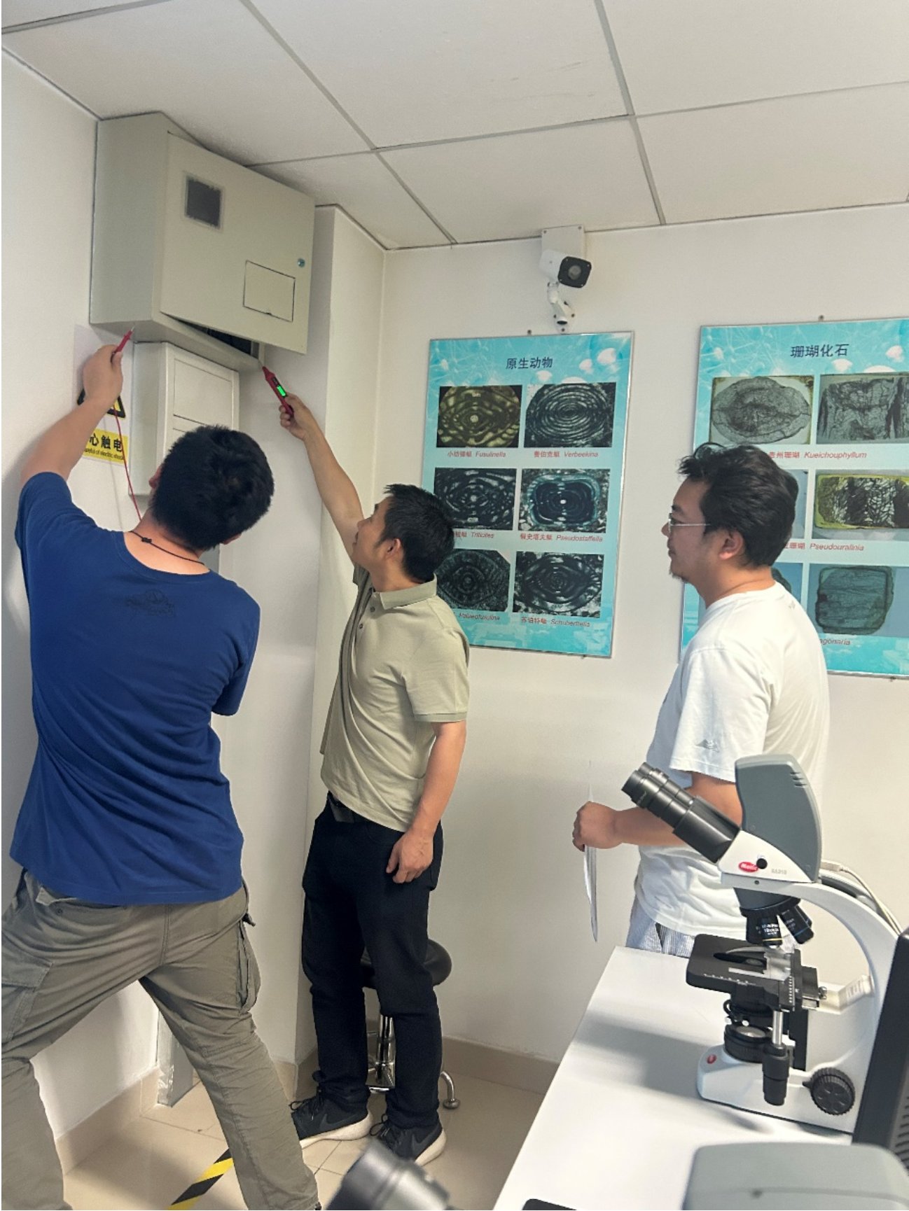 2024年6月17日下午,地球科学学院实验室安全督查组成员庞宏、王海洲及实验员李天天,针对实验室内部的用电安全进行了全面排查,旨在消除实验室潜在的用电风险,确保实验室人员和设备安全。