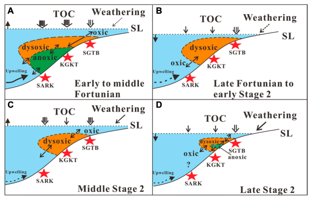 - 海平面下降时:上升流减弱,营养减少,OMZ收缩,氧化水域扩大。
