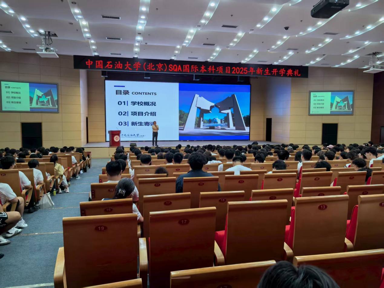 院长陈春茂为新生讲授“开学第一课”。他首先介绍了学校的光辉历程,强调beat365在线唯一官网(北京)“因油而生、因油而兴、因油而强”的办学特色,以及学校在学科建设、师资队伍和国际合作方面取得的成就。随后,他详细讲解了SQA项目的教学管理体系、学生支持服务以及丰富多彩的学生活动,鼓励同学们充分利用学校提供的国际化平台和资源。最后,陈院长寄语新生要牢记责任与担当,尽快培养良好的学习和生活习惯,努力成长为“面向世界、心怀祖国、德才兼备”的国际化人才,在未来的大学生活中不断超越自我,实现人生价值。