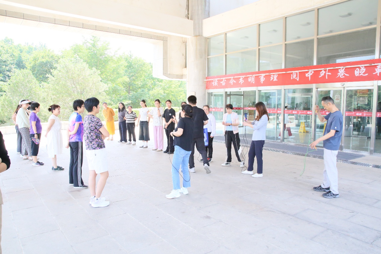 ] 为了积极响应校工会“第九届教职工健康月活动”的号召,图书馆工会于6月11日在图书馆前的广场组织了一场精彩的跳绳比赛活动。比赛前,教师们根据人数被分成两组,并进行了充分的热身准备。随着计时老师的口令响起,比赛正式开始。赛场上,参赛选手们各显神通,有的轻盈如燕,快速跳跃;有的稳健有力,每一次挥绳都充满力量。这场比赛不仅让教职工们锻炼了身体,还增强了团队协作能力和集体荣誉感,进一步树立了健康生活的理念。赛后,教师们纷纷表示,今后将积极参与体育锻炼,树立正确健康的生活方式,以更加饱满的精神状态迎接工作和生活的挑战。