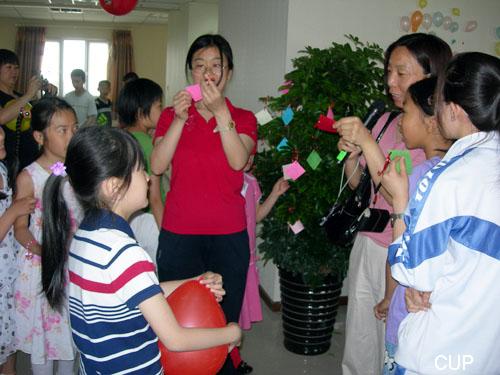 为了培养孩子们互助、友爱和奉献精神,体会人世间的关怀、爱心、温暖,让孩子们度过一个有意义的节日,本次活动特意安排了“祝福灾区小朋友们”这一环节。孩子们在系有红丝带的爱心小卡片上写满了祝福的话语,并把爱心卡挂在了“爱心树”上。孩子们在小卡片上写道:“我知道,这一刻,心被震碎了,很痛很痛。但是,我们会让你再次感受到爱。让爱没有残缺……”;“亲爱的朋友,请你鼓起勇气!!我们为你撑起一片蓝天,也请你们珍惜生命,手牵手,我们一起走。共同寻回美丽的家园。明天会更美好!”;“希望灾区的小朋友早日回到自己熟悉的教室!”;“六一儿童节到来之际,愿灾区小朋友抛弃悲伤,点亮希望之烛,祝灾区小朋友六一节快乐!”……只言片语表达了孩子们对灾区小朋友的牵挂和祝福,我们相信灾区的小朋友们一定会感受得到这份真挚的祝福。