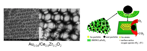 设计了一类新型的催化剂––三维有序大孔复合氧化物担载金催化剂,并首先将其应用于固体颗粒物质的催化氧化反应中(见图3)。金活性组分提供了优异的活化氧和使NO氧化为NO2的能力,三维有序大孔载体提供了PM良好的接触与扩散通道,所以这类担载金催化剂对PM氧化的催化活性获得了目前文献报道中活性最好的结果,特别是松 散接触条件下炭黑在3DOM Au0.04/LaFeO3催化剂上氧化的起燃温度仅为228 °C,显著低于世界上文献报道活性最高的Pt基贵金属催化剂。