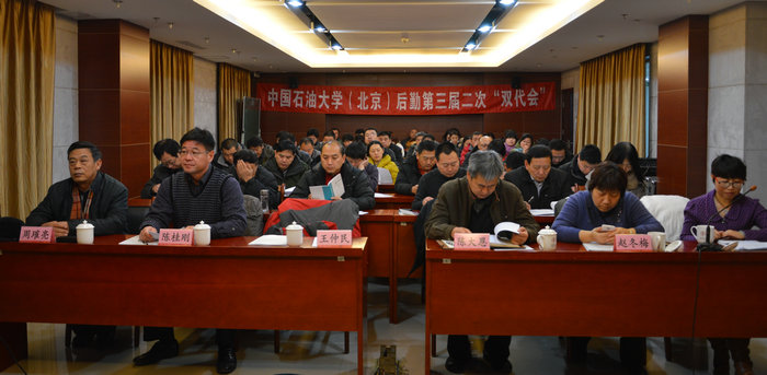 12月31日上午,后勤第三届二次“双代会”在中油大厦316会议室召开,会议由后勤工会主席刘海燕主持,副校长陈大恩、校工会常务副主席王仲民到会祝贺并发表了讲话。