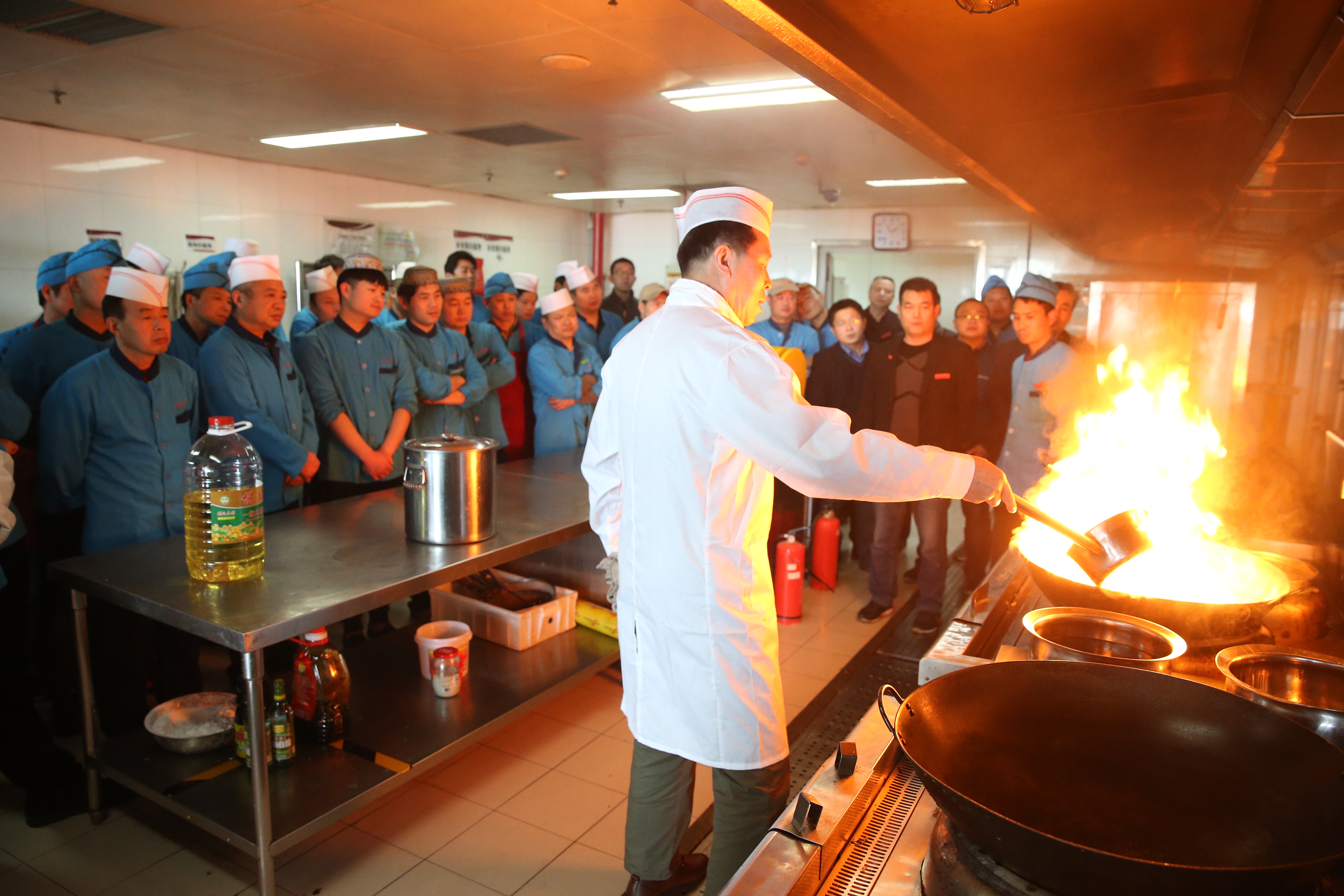 食堂内部用电、用气设备较多,消防安全一直是食堂安全工作中的重点。在培训中,公司监督部主任、安全员李德忠针对后厨工作岗位的性质,就火灾发生的主要原因、种类、预防措施、处理办法、消防器材的正确使用与保养等内容进行了讲解与指导。随后,培训人员进行了消防操作演练。