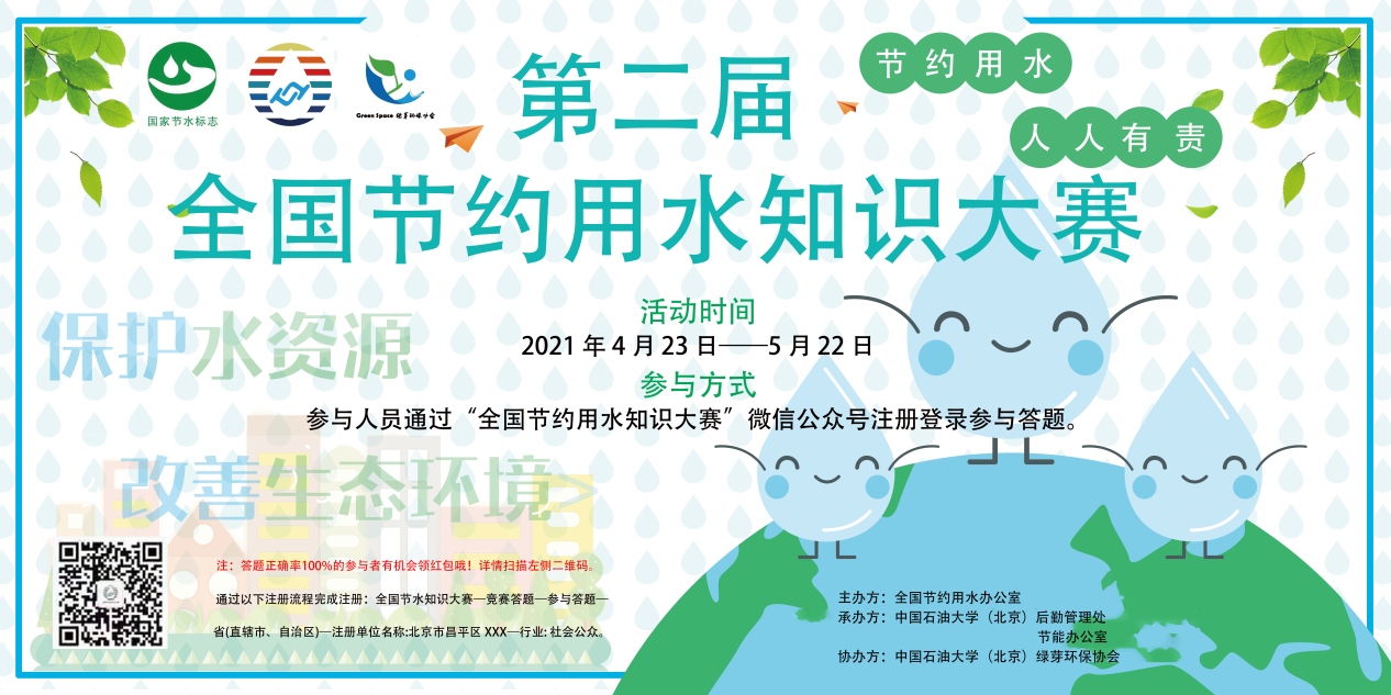 2021年5月9日至5月15日,是我国第30个“城市节约用水宣传周”,今年的活动主题为“贯彻新发展理念,建设节水型城市”。为了更好地贯彻习近平生态文明思想,加强节水型城市建设,推动节水宣传进校园,学校绿芽环保协会积极响应化学工程与环境学院及后勤管理处节能办公室的号召,利用“世界水日”“中国水周”等节水宣传契机,开展了一系列节水宣传活动。