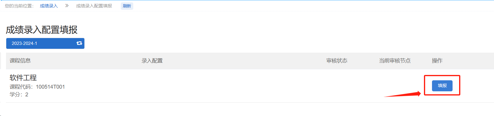 1.进入成绩录入配置填报功能后,点击课程后的“填报”按钮进行填报。若此处没有显示对应课程,请联系学院教学秘书维护课程对应的课程负责人