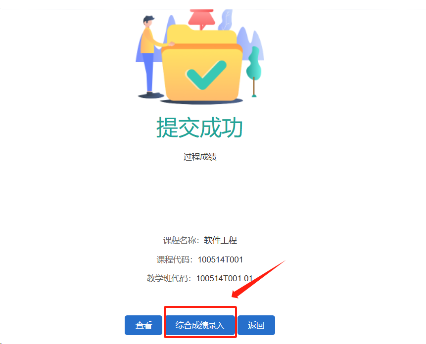 提交成功后会显示成功页面,点击页面下方的“综合成绩录入”按钮,可以直接进入到总评成绩录入页面。