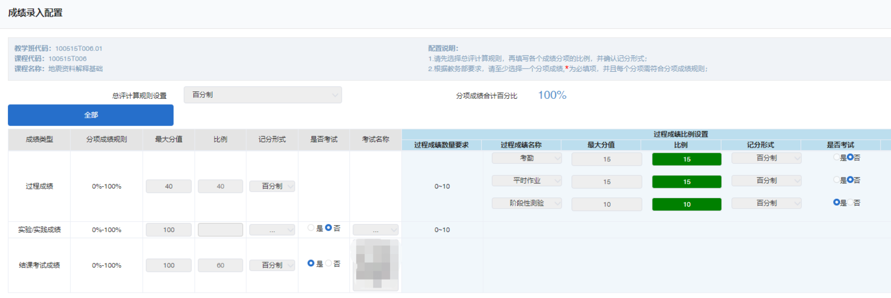 若教师录入成绩时,按照实际成绩进行录入而非满分100录入,则在录入各类过程成绩时,最大分值应填写实际最大分值,比例填写此类成绩在总成绩中的占比,占比之和仍需要等于过程成绩总占比。