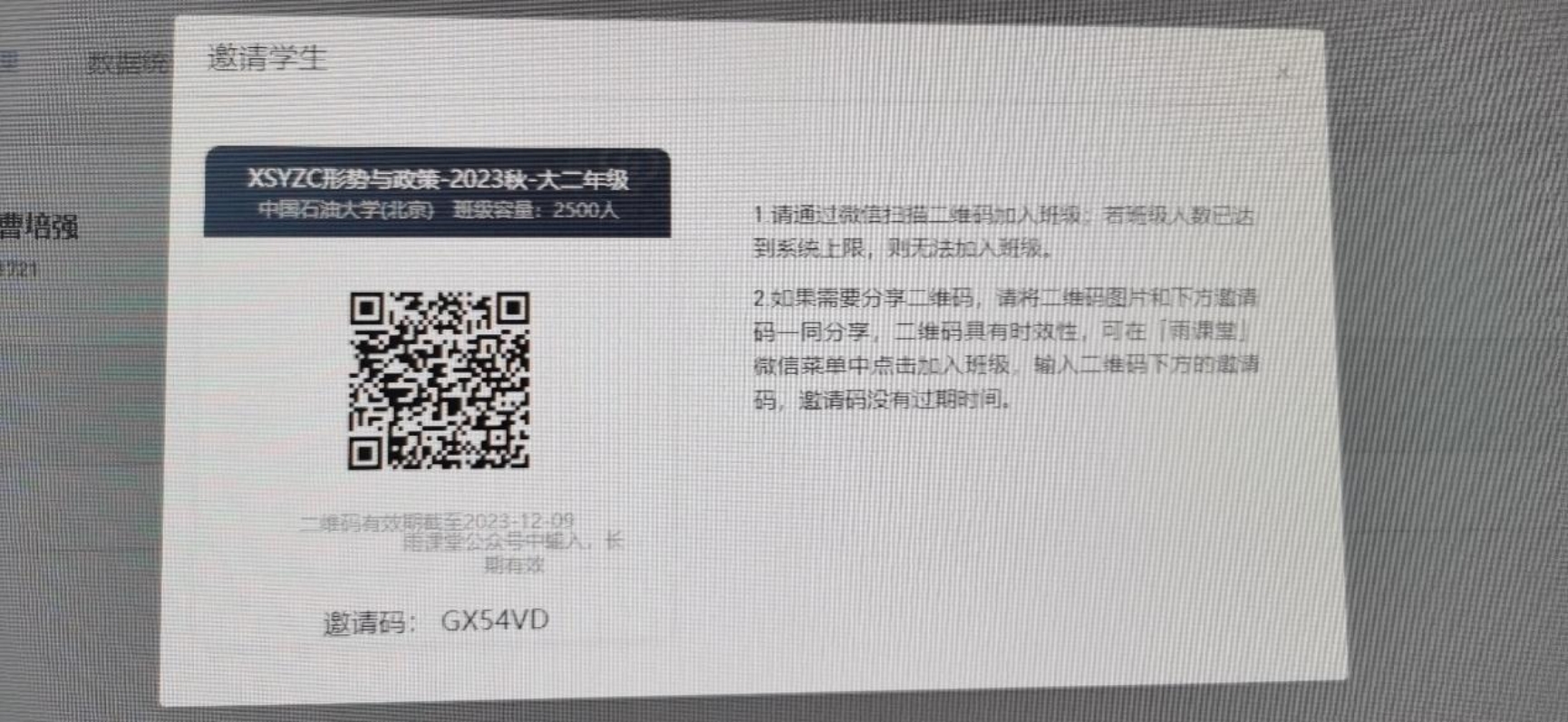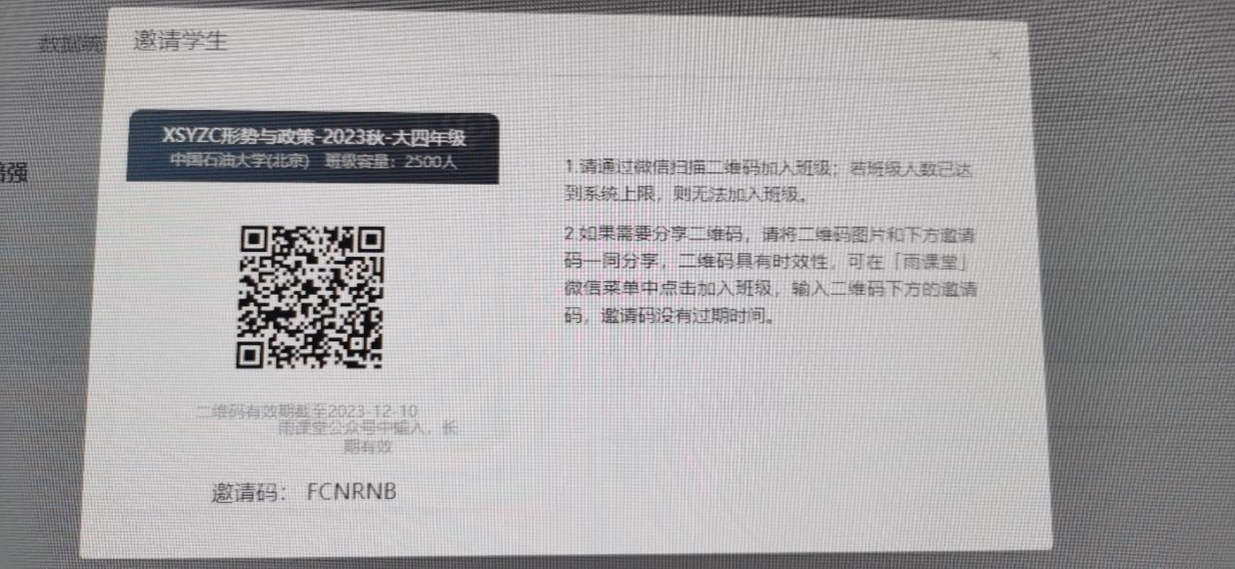由于《形势与政策教育》课程改革,相关课程采用线上授课方式进行。请于12月1日前扫描下图二维码,加入网络教学平台相应年级的《XSYZC形势与政策》课程,进行本学期线上课程学习。学生扫码加入班级后,由负责教师通过线上平台发布学习任务和要求,期末记录过程成绩。