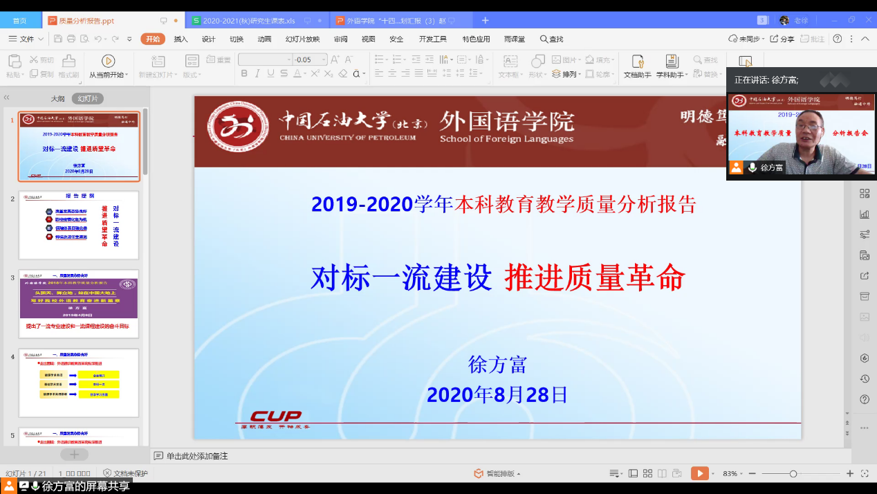 地球科学学院总结了学院在专业建设、教学资源建设、教师教学能力发展、教学改革、质量保障体系建设等方面取得的成绩,并结合学院十四五规划,对目前存在的问题及下一阶段的工作思路、整体规划和预期目标作了说明。与会教师围绕质量分析报告进行研讨,在专业建设、课程建设、学生培养等方面提出了建议与意见。