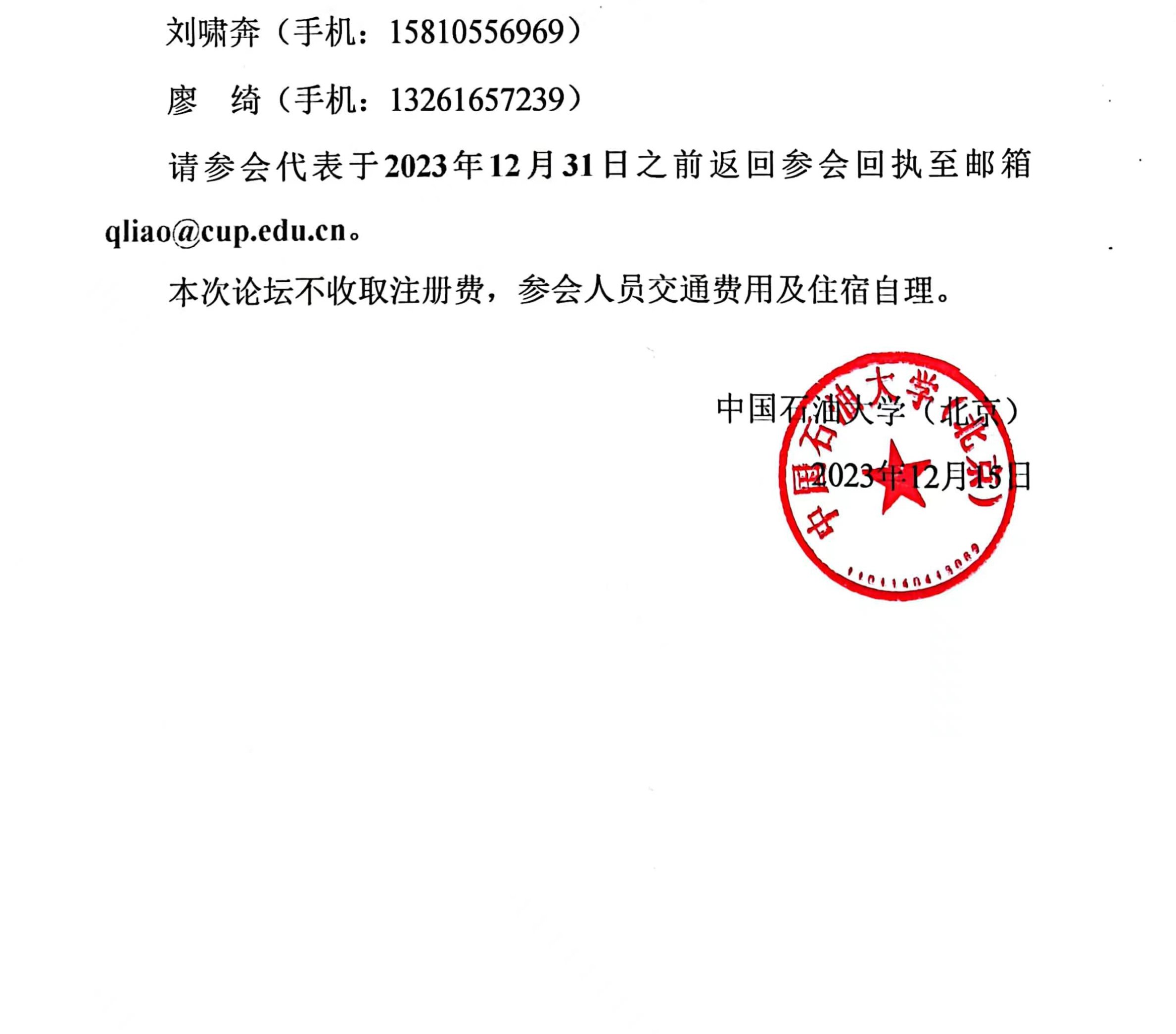 注1:为便于会务组为您提供更周到的服务,请于2023年12月31日之前发送参会回执至邮箱qliao@cup.edu.cn。