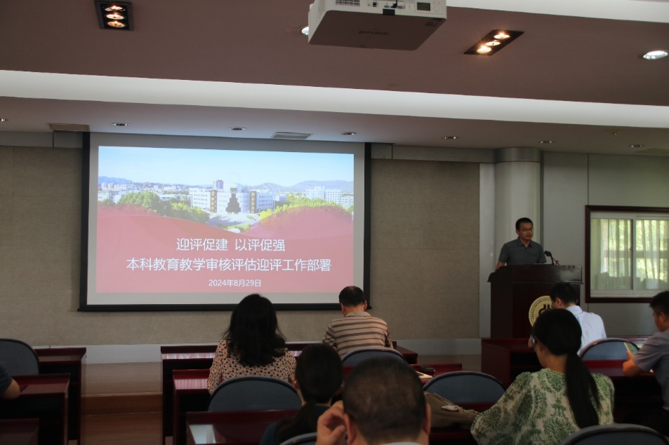 本科教学副院长张行从迎评工作安排、任务、要求等方面对本科教育教学审核评估迎评工作进行了详细部署,并提出了的具体要求。他强调,要以新一轮本科教育教学审核评估为契机,带动学院人才培养能力的提升,要进一步强化大局意识与责任意识,细致分工,确保每一项迎评任务落到实处,保障本科教育教学审核评估的顺利进行。
