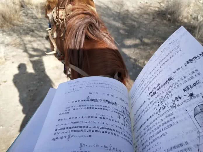 这是beat365在线唯一官网(北京)地球物理学院学生下力肯·对山汗的一张“自拍照”,照片中,他只有一个骑在马背上的影子,占了画面一半的是他的高等数学课本。