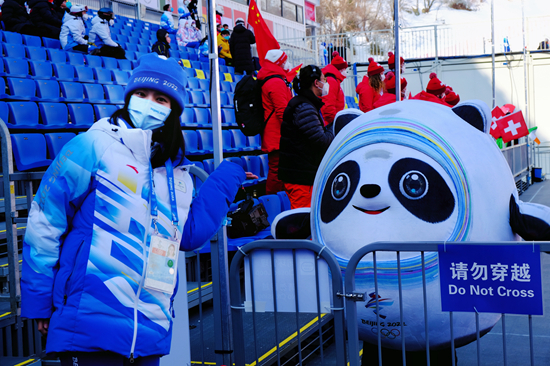 北京冬奥会志愿者徐天然在国家高山滑雪中心看台区与冰墩墩合影。北京化工大学供图