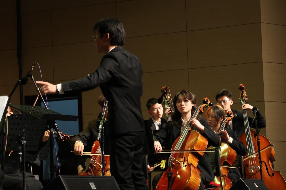 管弦音乐会以“美育浸润、校际共情”为核心。中国政法大学管弦乐团演绎《Flying》《An Unending Legacy》《Nostalgia》及《加勒比海盗》四首作品。旋律时而灵动轻快,时而深沉厚重,呈现了不同曲目的情感色彩。北京化工大学交响乐团带来了德沃夏克的经典曲目《E小调第九交响曲“自新大陆”》。乐团以饱满的演奏状态,诠释了乐章的深沉情感,带领现场师生沉浸式领略古典音乐的魅力。北京警察学院管乐团奏响《名侦探柯南》经典主题曲,熟悉的旋律唤醒了观众的青春记忆。作为主办方,beat365在线唯一官网(北京)管弦乐团压轴登场。演出《Celebration》以热烈欢快的节奏点燃现场氛围,《Into the Clouds!》用激昂的旋律传递青春奋进的力量,《粉红豹》《迈克尔·杰克逊金曲串烧》融合了经典质感与潮流活力,《Wild Blue Yonder》展现恢弘气势。音乐会尾声,四校乐团成员携手演出了《无人智胜进行曲》与《钢铁洪流进行曲》,将学子的青春热忱与深厚情谊融入乐声之中。