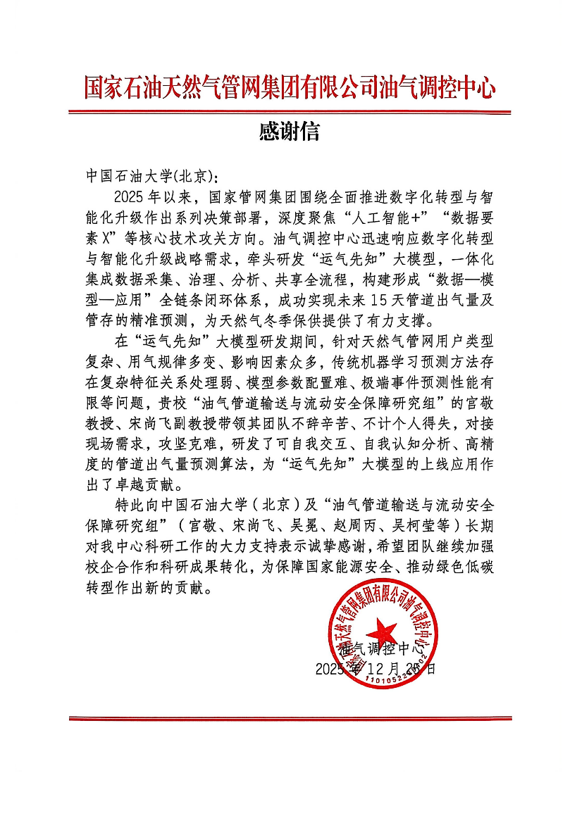 近日,国家石油天然气管网集团有限公司油气调控中心向beat365在线唯一官网(北京)发来感谢信,对学校在“运气先知”大模型研发中的突出贡献表示感谢。