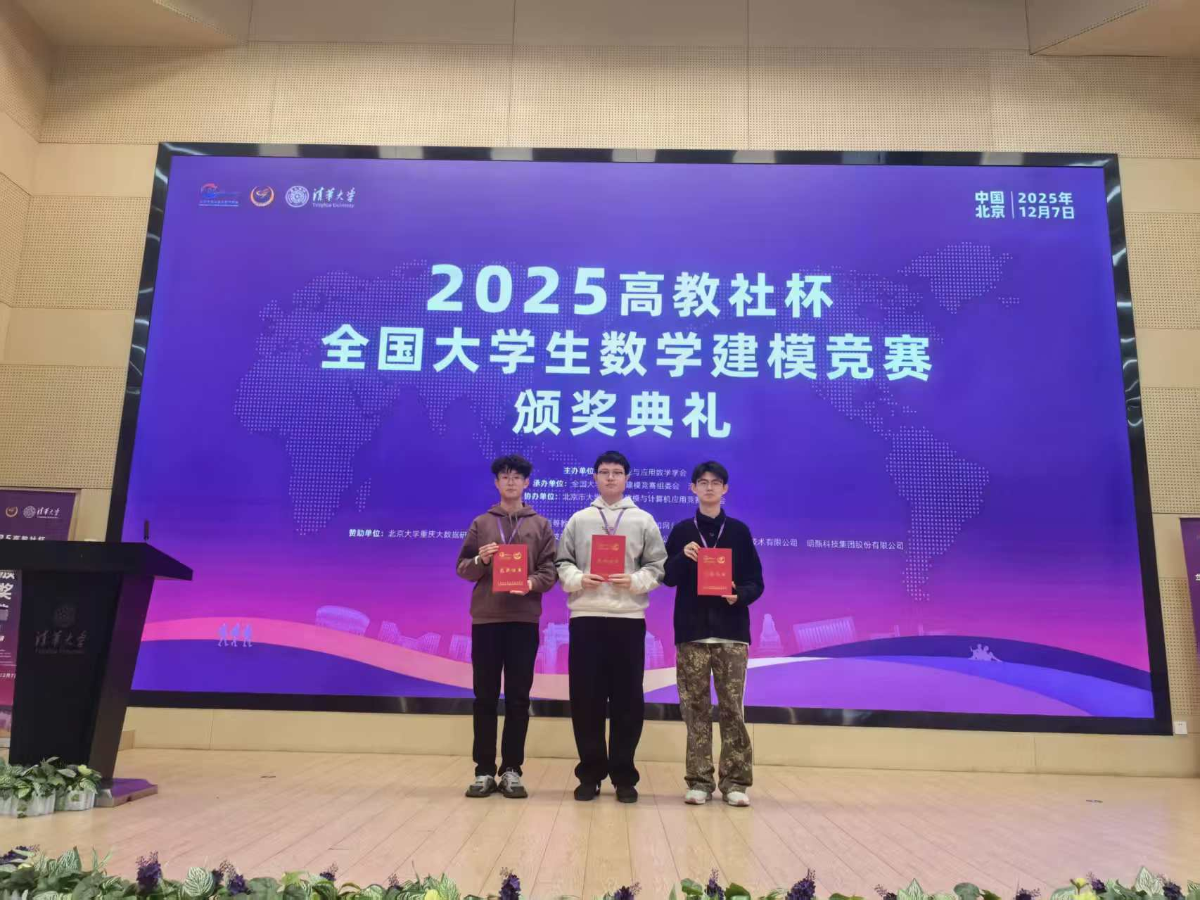 近日,由中国工业与应用数学学会主办、全国大学生数学建模竞赛组委会与清华大学承办的2025年“高教社杯”全国大学生数学建模竞赛颁奖典礼在清华大学落幕。中石大在此次竞赛中取得突破性成绩。其中,由理学院数学与应用数学专业2023级叶承志、胡朝熠以及安全与海洋工程学院安全工程专业2023级曹云组成的团队,在理学院教师董少群的指导下,获全国一等奖(获奖比例为0.48%);由理学院2024级应用化学专业顾智辉、经济管理学院2023级市场营销专业颜新颐与人工智能学院2023级计算机科学与技术专业段盈君组成的团队获全国二等奖。此外,学校还有9支队伍获北京市奖项,其中一等奖1项、二等奖8项。
