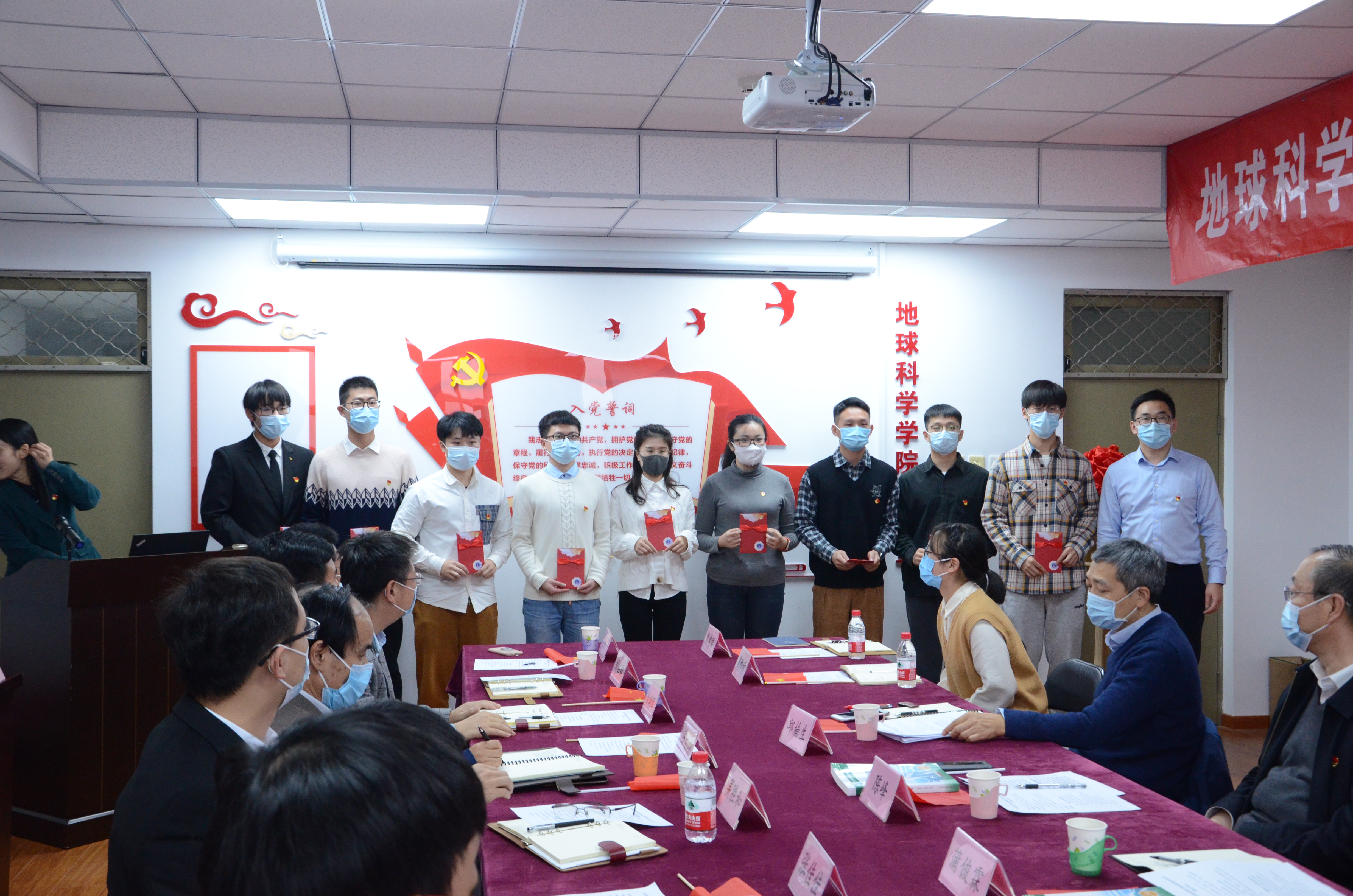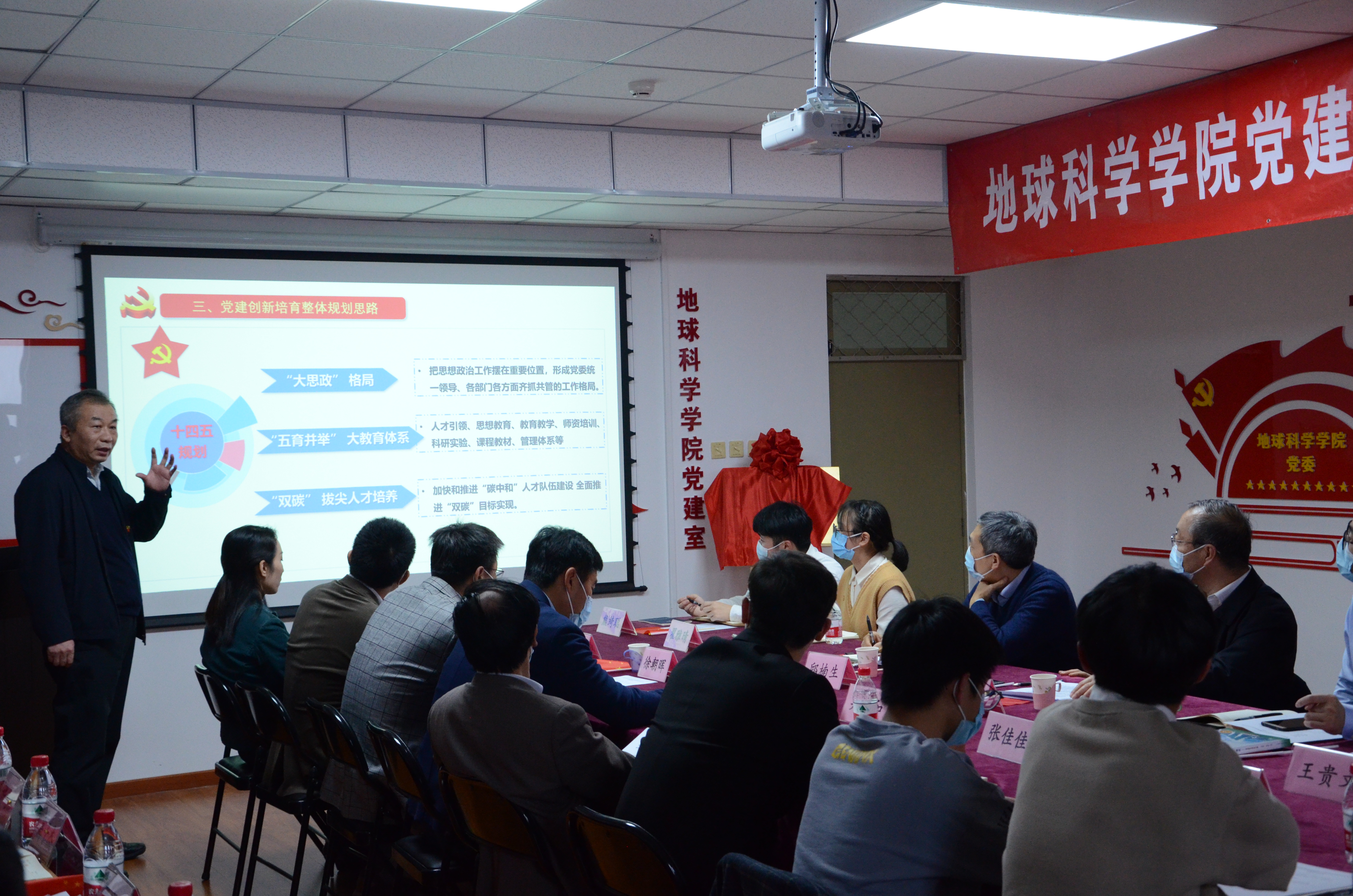 在全体参会人员的掌声中,陈峰为地球科学学院新建的党建室揭牌。全新的党建室、全新的培育模式,激励着学院党建工作再启新征程。