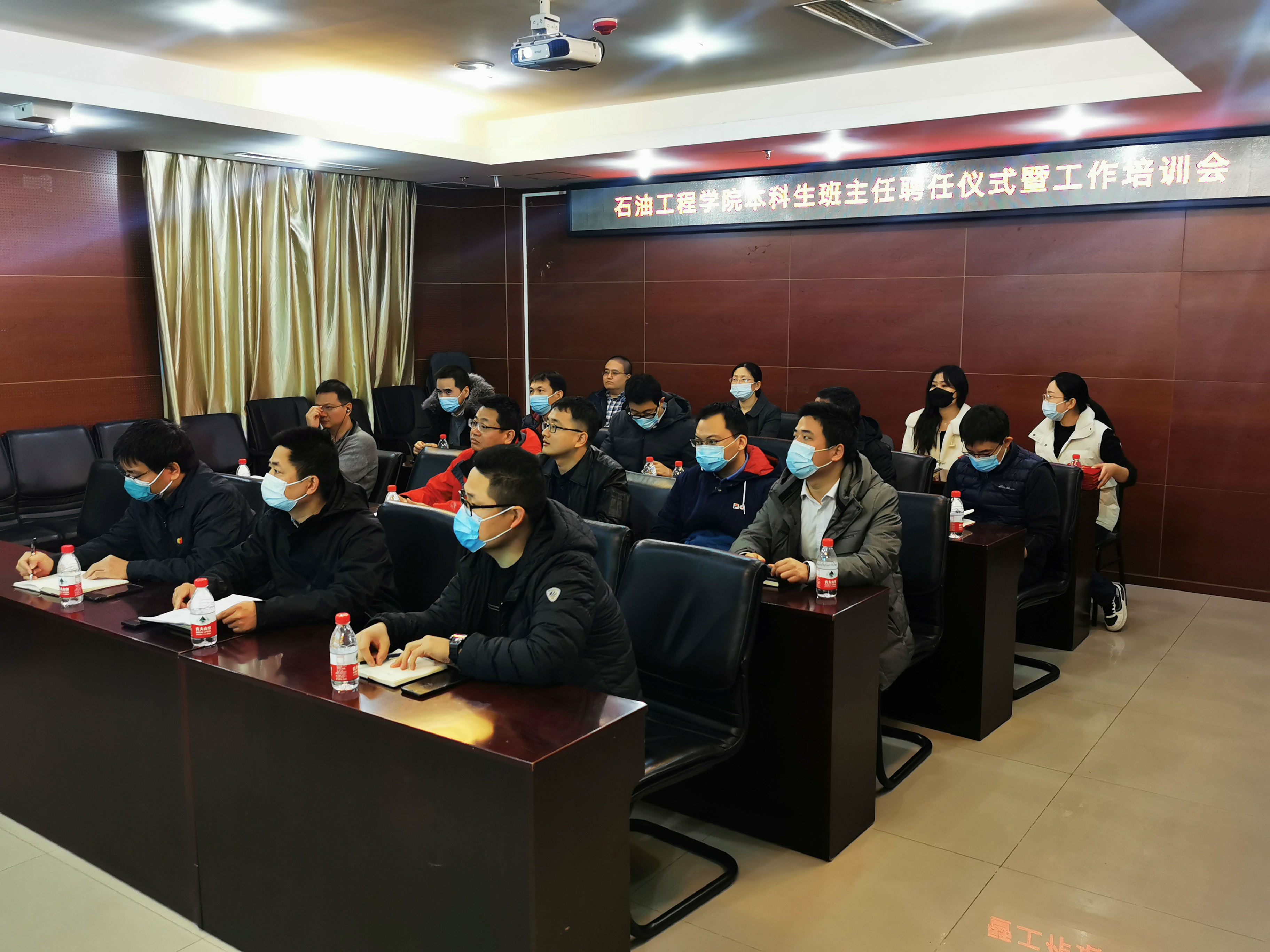 黄世军、学校学生工作处处长庄玉琳为学院全体本科生班主任颁发了聘书。庄玉琳从学校学生工作形势、辅导员队伍现状和教师队伍优势等方面,解读了学校出台班主任和学业导师文件的背景,希望石油工程学院本科生班主任和辅导员、学业导师密切配合,齐心协力,打造学院育人工作特色,培育一流人才。学院党委副书记刘东东详细介绍了学院本科生的基本情况和特点,以及班主任工作的优势,解读了班主任工作的职责,分享了做好班主任工作的心得体会,希望班主任用情用力用心做好工作,助力学生成长成才。